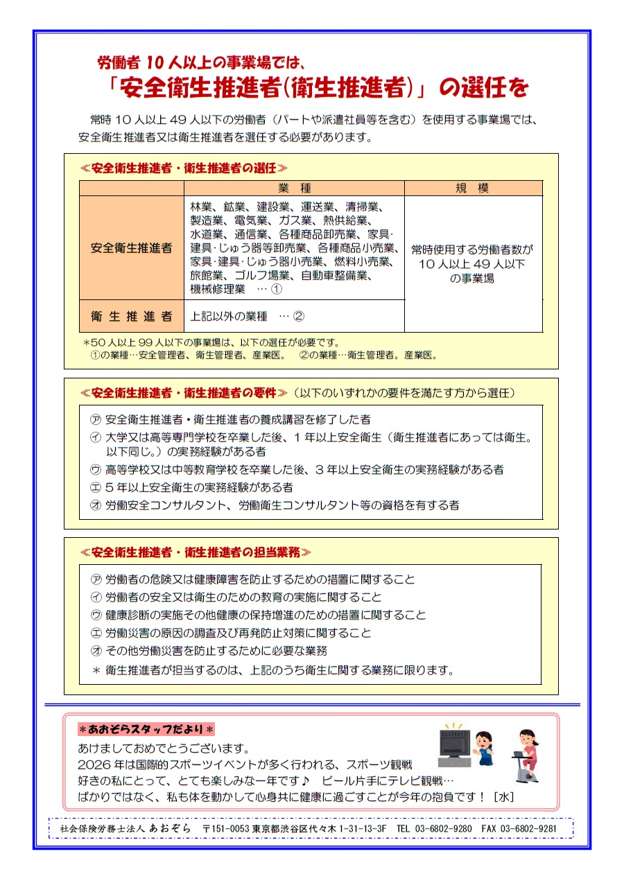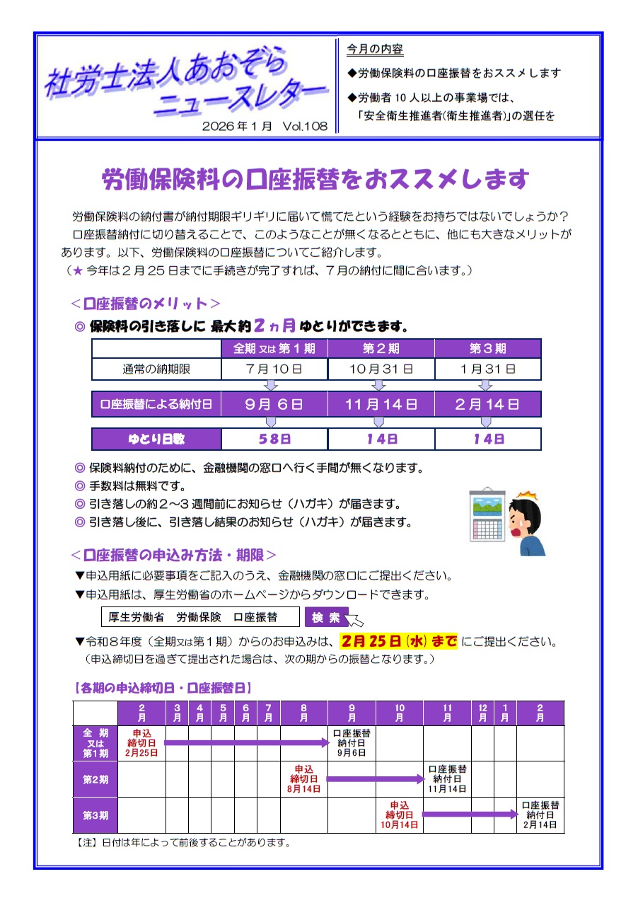 2026年1月号 労働保険料口座振替のススメ/「安全衛生推進者(衛生推進者)」の選任